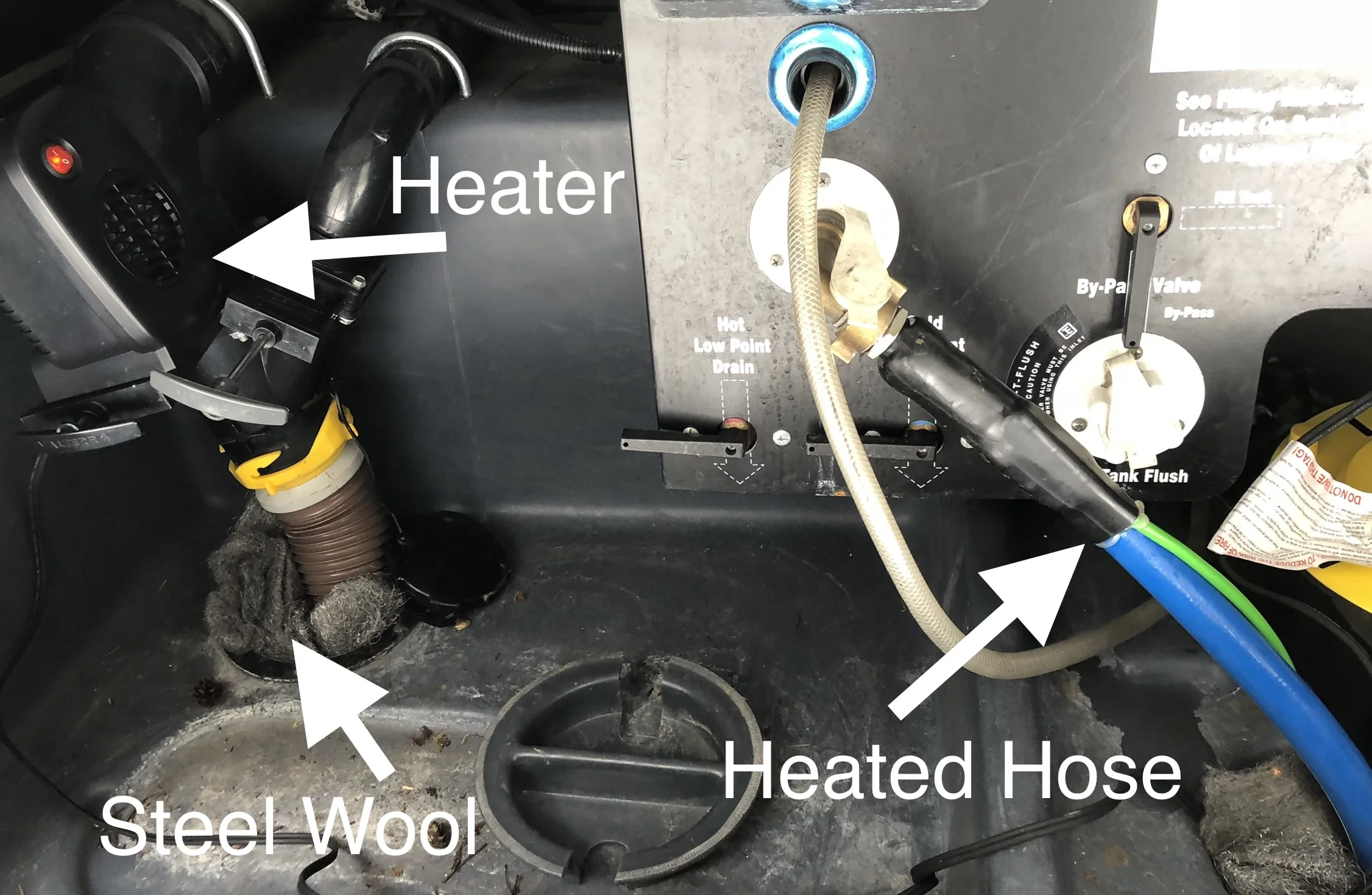 Keep your water dripping when temperatures go below freezing. This will help reduce the chance of frozen pipes, but it won't prevent it from happening. In fact, it did happen to us, so we still recommend a heated hose along with this habit. Keeping your cabinets open at night will allow the heat to reach pipes too. We actually have a forced air heater pointed directly at our open cabinet in the bathroom. This is to help keep the tanks and pipes warm, though also helps keep the bathroom nice and toasty.